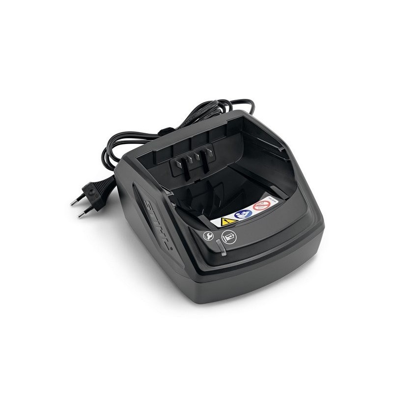 Chargeur pour la gamme d'outils à batterie sans fil STIHL. Avec indicateur de l'état de charge (LED) et enrouleur de câble Velcro. Le chargeur peut être fixé au mur si nécessaire.
