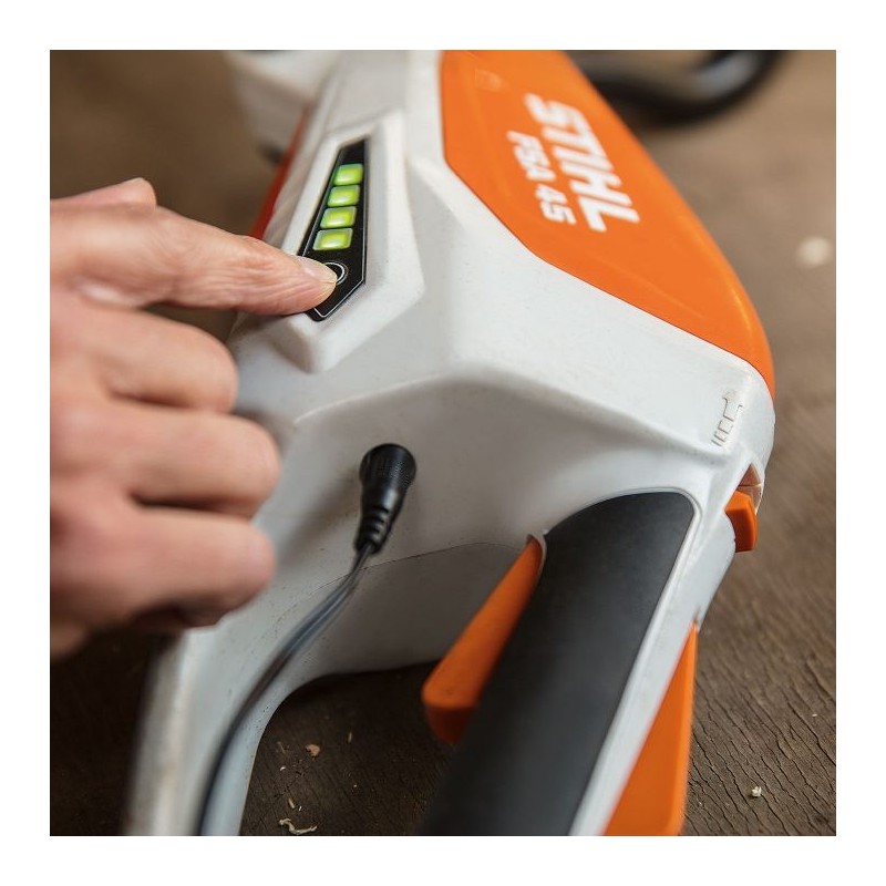 - Une batterie Lithium-Ion intégrée avec indicateur de charge : intégrée au design, elle offre une ergonomie et un équilibre parfaits. Durée de charge de 145 / 210 minutes (80 % / 100 %) et autonomie de 20 minutes (chargée à 100%) avec lame ou 12 minutes avec fil PolyCut 2-2.