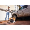 - Une flexibilité maximale : grâce à la technologie de la batterie AK et au fonctionnement eau/aspiration, il est possible de travailler indépendamment de tout raccordement en électricité ou en eau (en travaillant au choix avec une alimentation en eau pressurisée ou en mode aspiration grâce à un tuyau d’aspiration). Seule une source d’eau est nécessaire : l’eau d’un récupérateur de pluie par exemple, ou celle du chariot avec réservoir d’eau de 20 litres, disponible en accessoire.