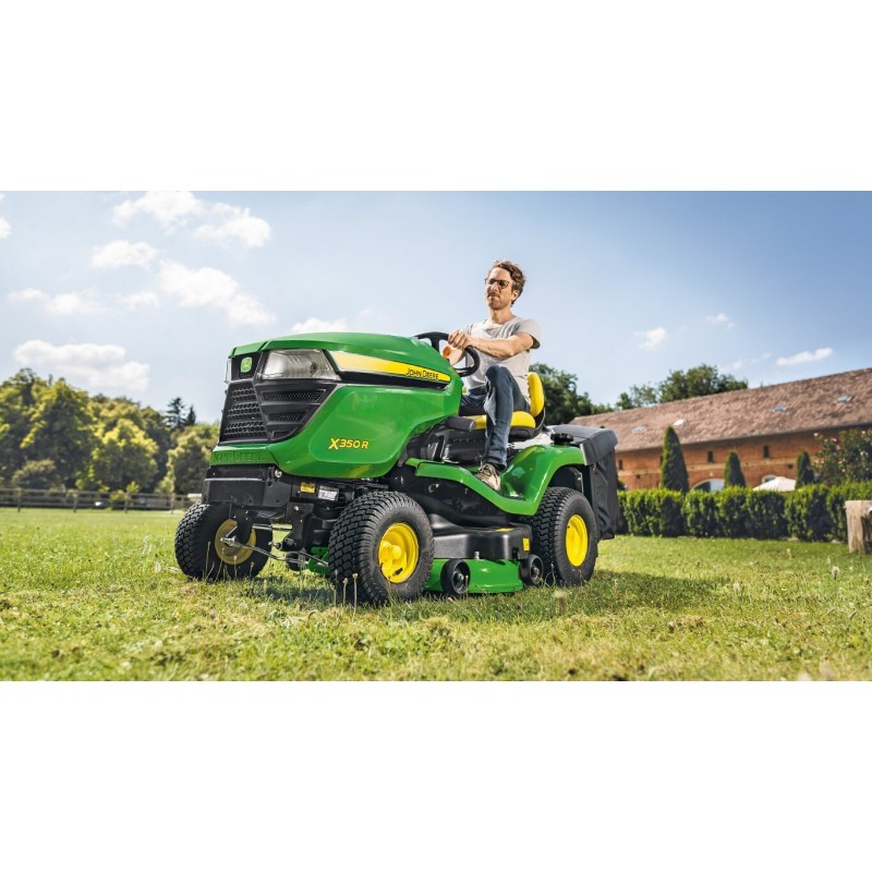 Si vous recherchez une entrée de gamme abordable sans superflu dans le segment des tracteurs de jardin, la X350 est faite pour vous. Une console moderne rappelant une voiture, des commandes à la disposition ergonomique et ses pédales de contrôle de la transmission Twin Touch™ permettent une expérience de tonte sans effort. Vous avez le choix entre différentes unités de coupe, si bien que vous pouvez trouver la X350 qui correspond parfaitement à vos besoins.